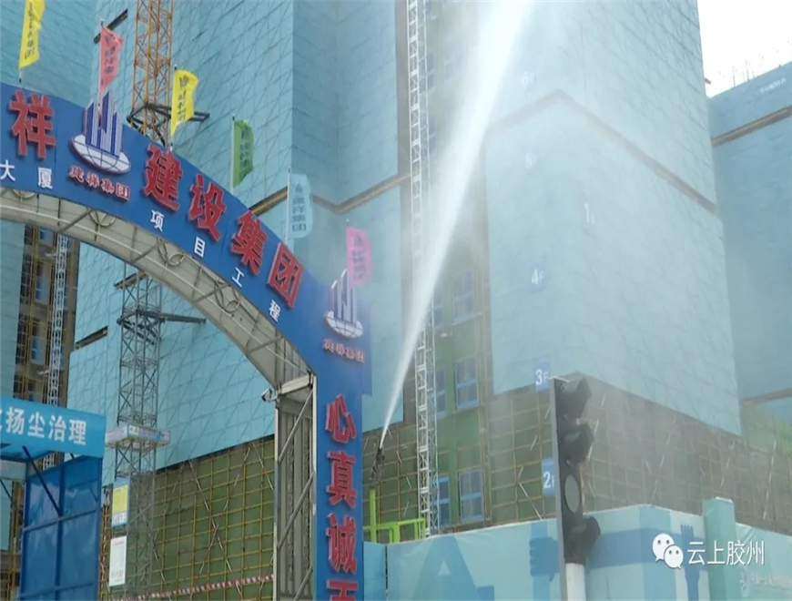 工地揚塵污染是工地標準化治理的一大難點。走進達能大廈工地,各種降塵設備齊發(fā)力,外部、內(nèi)部線性噴淋系統(tǒng)24小時開啟,大型霧炮機保證進出車輛噴水降塵。幾名保潔人員作為環(huán)境專管員每天對硬化路面進行沖洗,建筑工地沒有了人們印象中塵土飛揚的現(xiàn)象。